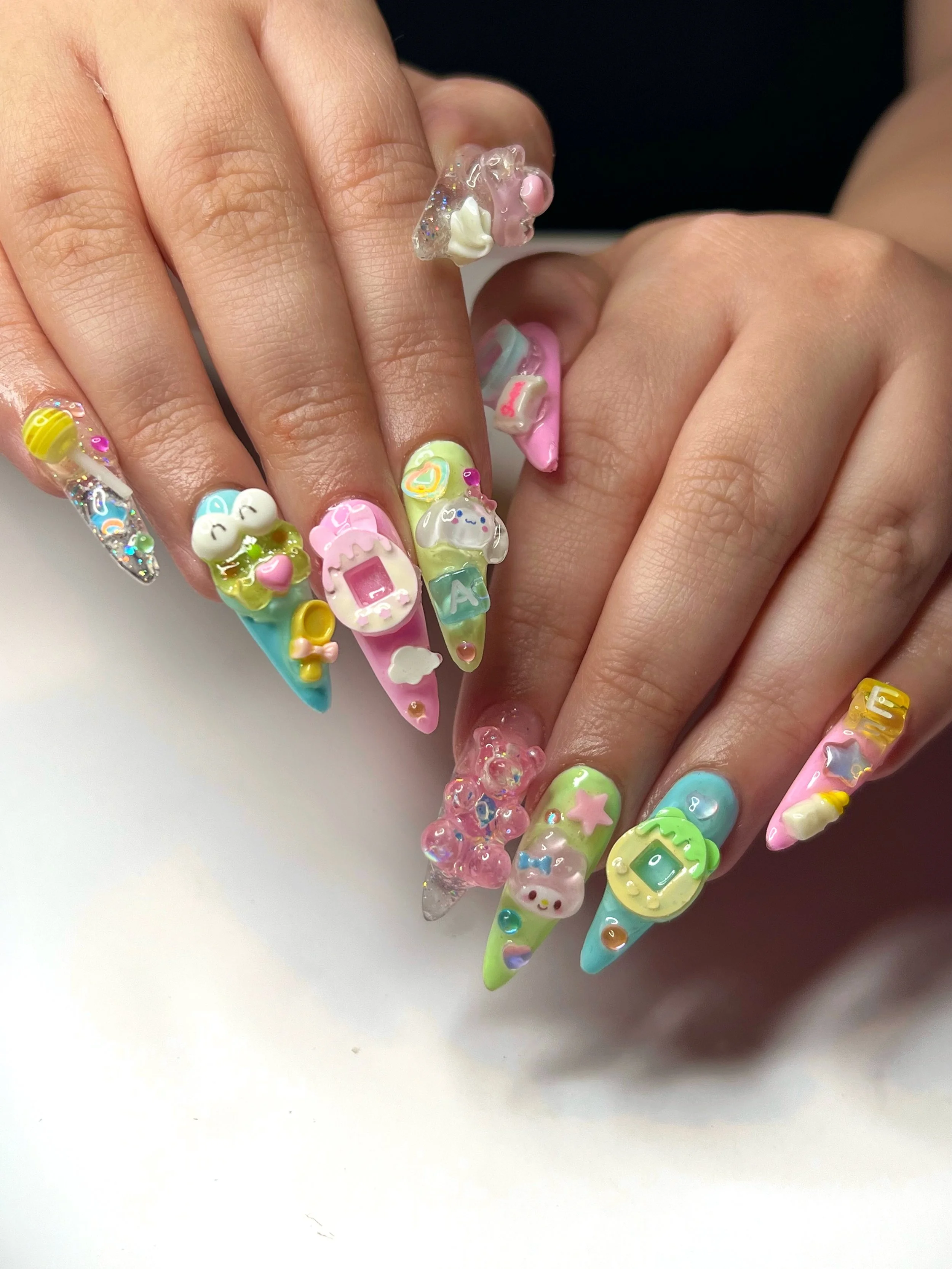 “My desk is like a playpen. When I'm doing nails, there's so much paint, colour, glitter and glue everywhere and everything's sticky,” Liv describes. “When a client comes in who wants to collaborate, it’s really like we are playing, like we're basically doing arts and crafts. It's truly very satisfying for my inner child, and I always try to encourage people to be as colourful and crazy as possible because that's how I was when I was a kid.”